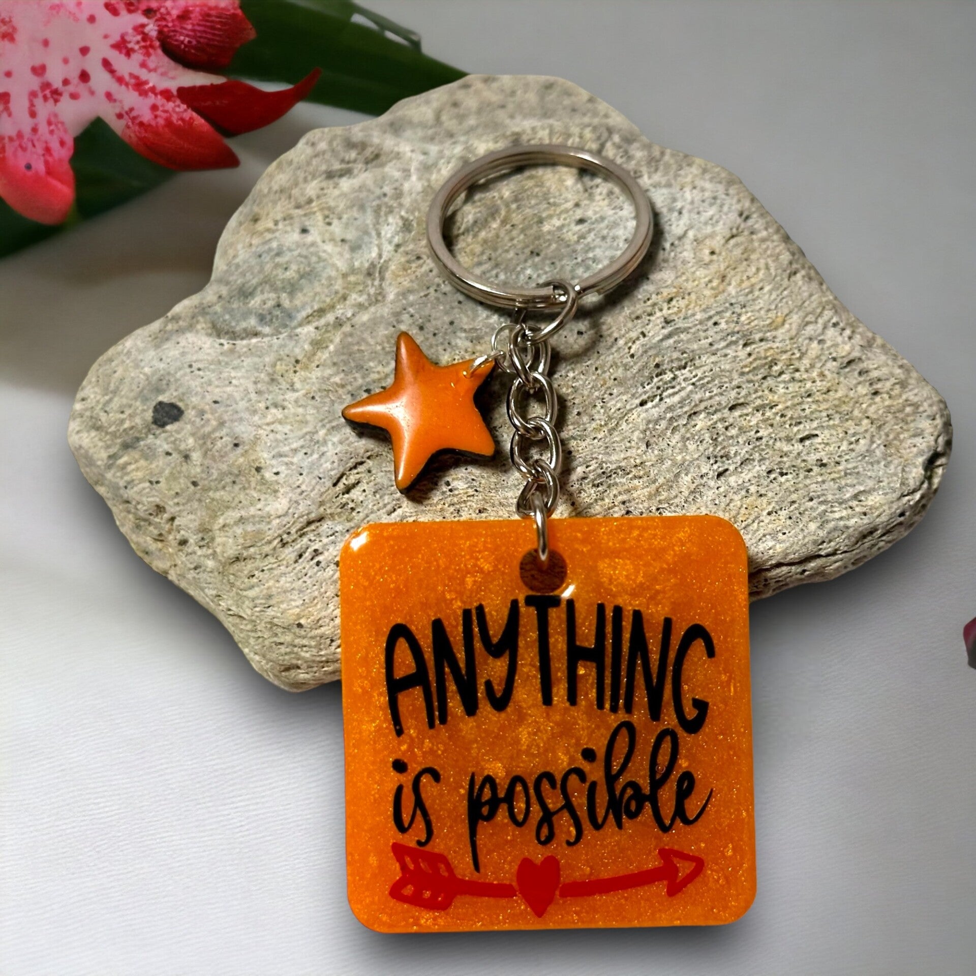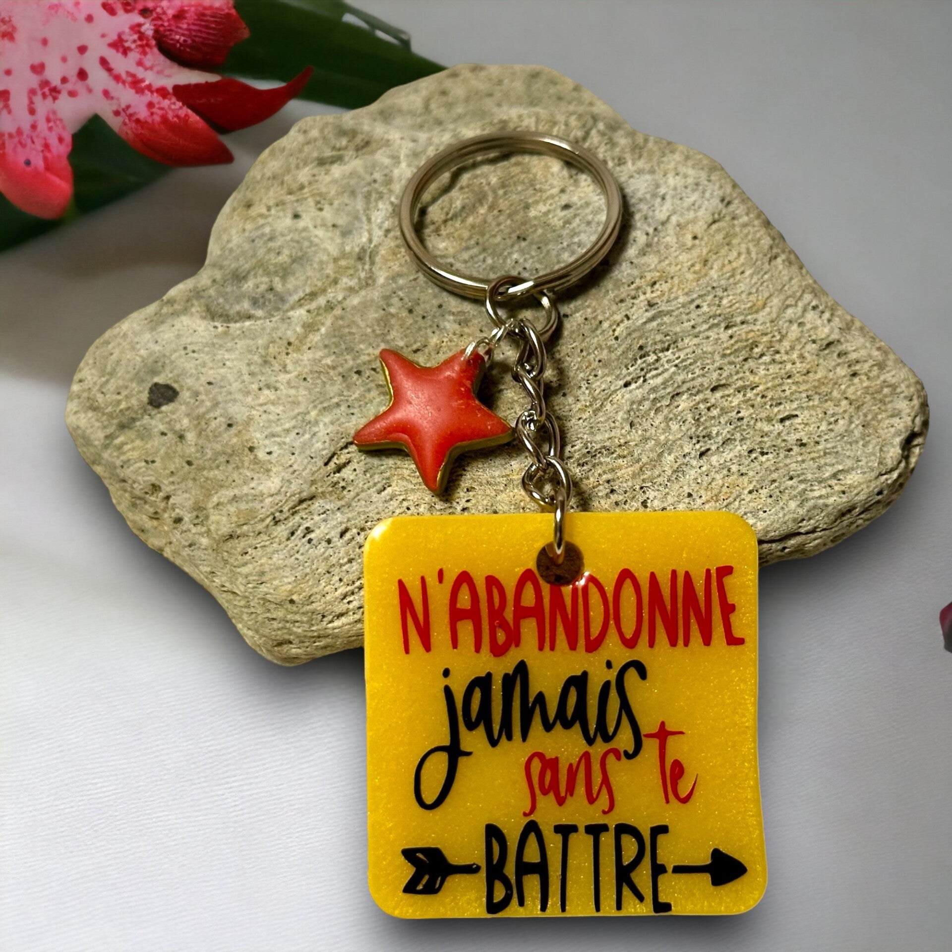 Ces porte-clés ont été conçus par coulage de résine dans un moule. Les messages incrustés sont des expressions positives. Ils sont réhaussés par une petite étoile réalisée en pâte polymère.